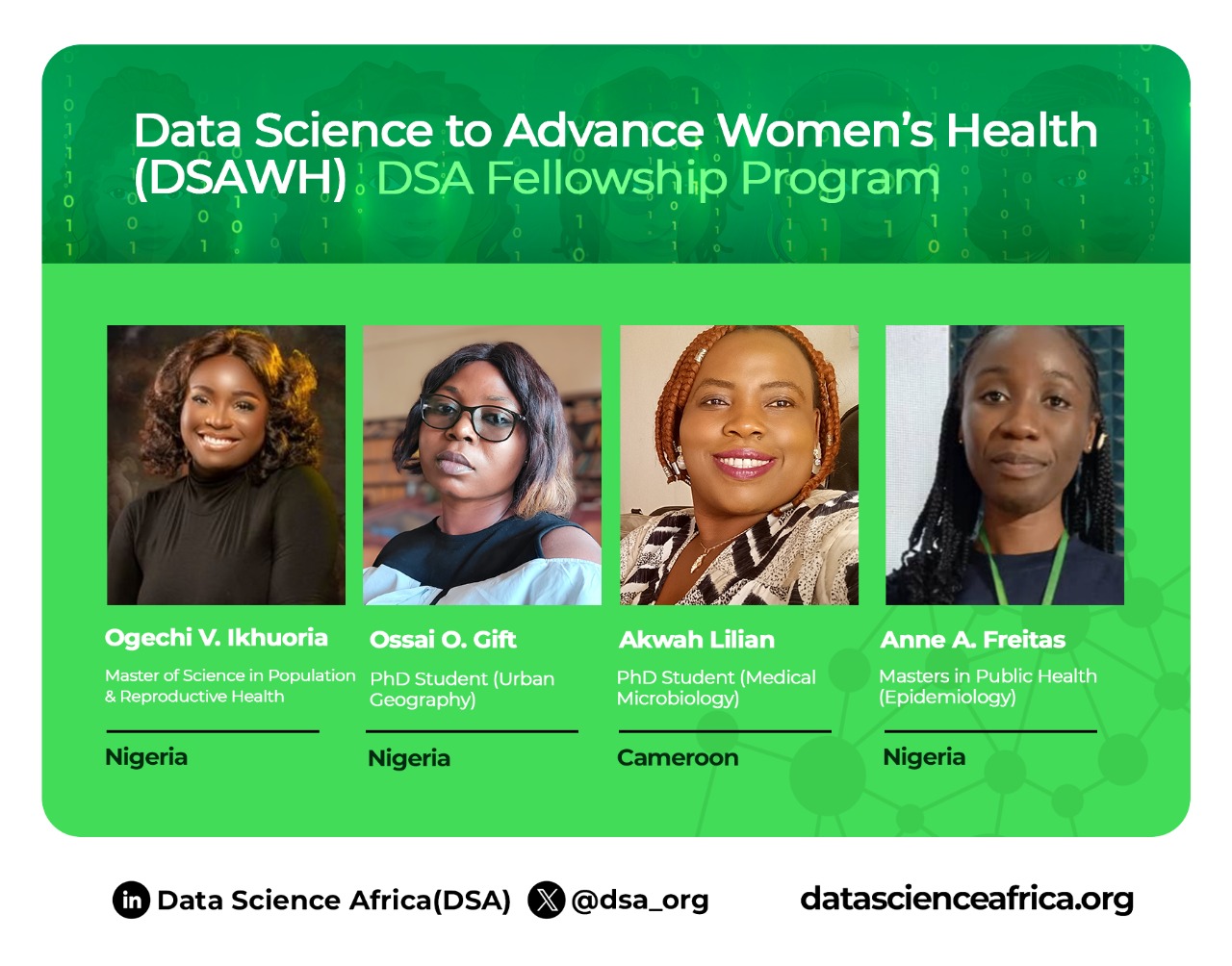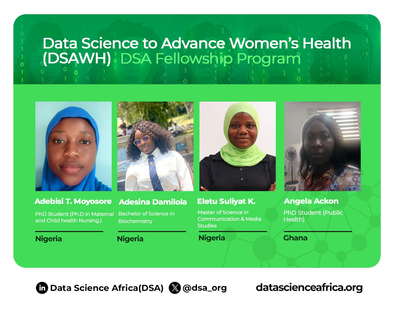 Data Science Africa (DSA) is proud to announce the launch of the Data Science to Advance Women's Health (DSAWH) Fellowship Program, starting with the 2025 West Africa Cohort of 20 early-career women researchers.