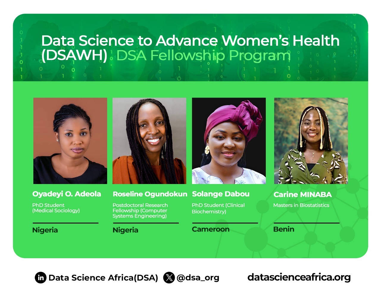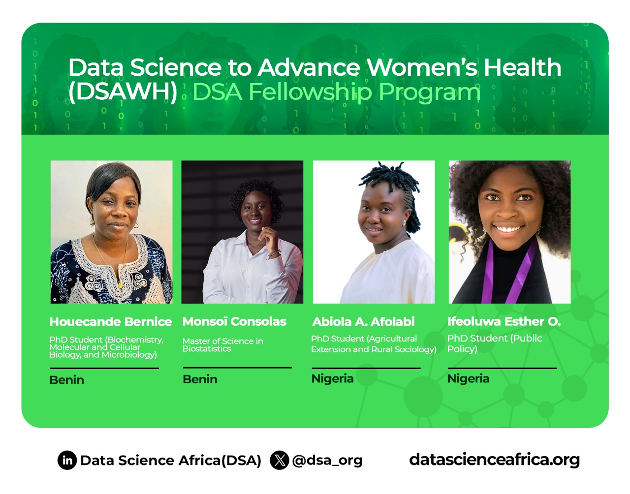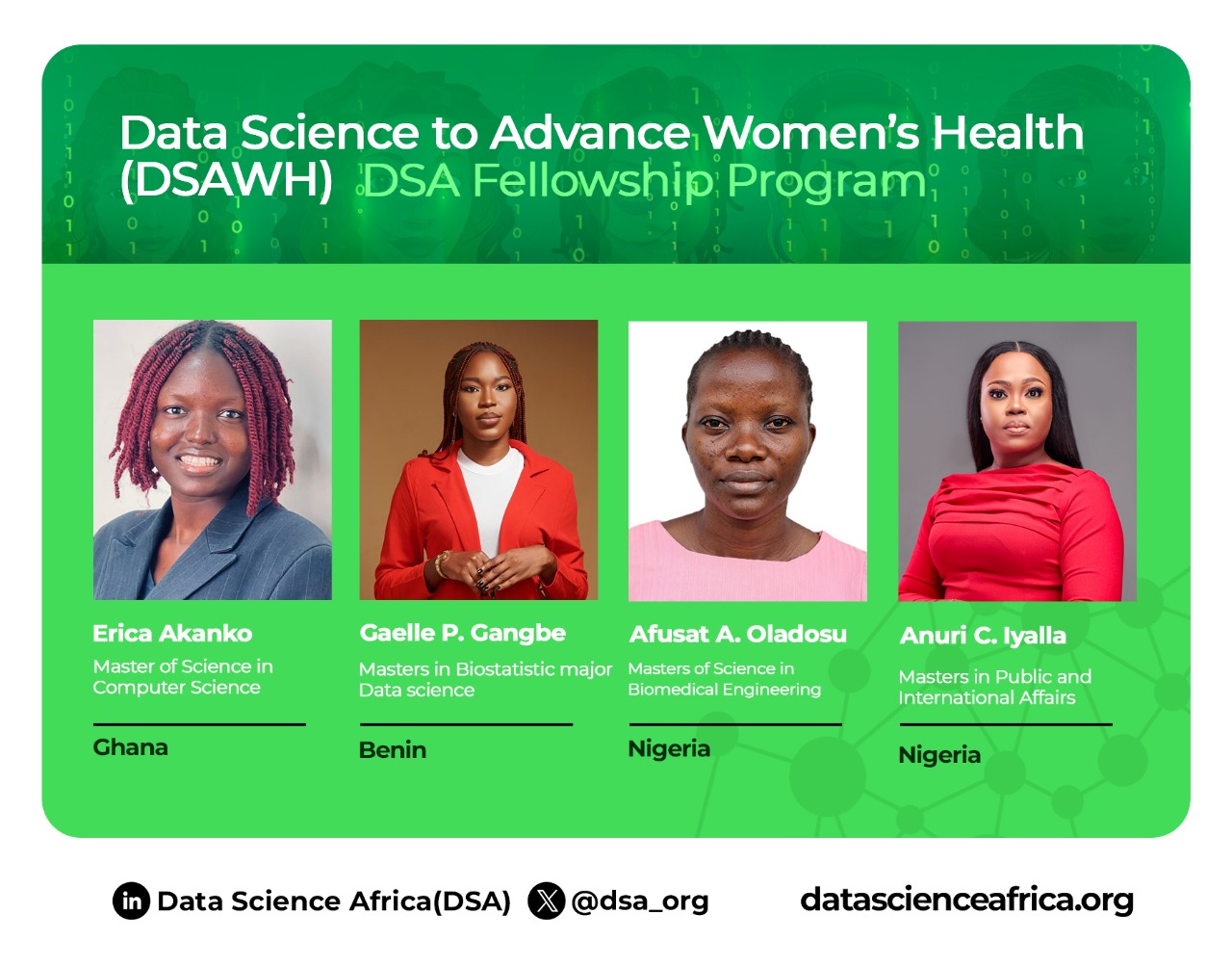Data Science Africa (DSA) is proud to announce the launch of the Data Science to Advance Women's Health (DSAWH) Fellowship Program, starting with the 2025 West Africa Cohort of 20 early-career women researchers.